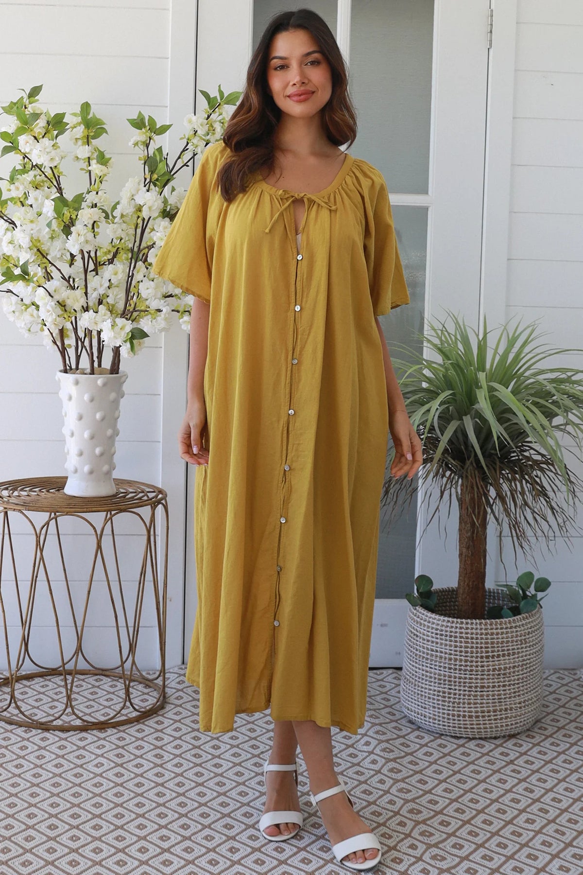 Meet the Sally Dress — your new wardrobe staple in a warm, sun-kissed mustard. Woven in a relaxed 70% cotton, 30% linen blend, she's the kind of dress you reach for again and again. Dress her up for the office, throw her on for brunch, or pair with your favourite sneakers for an effortlessly cool weekend look — the Sally truly does it all.
