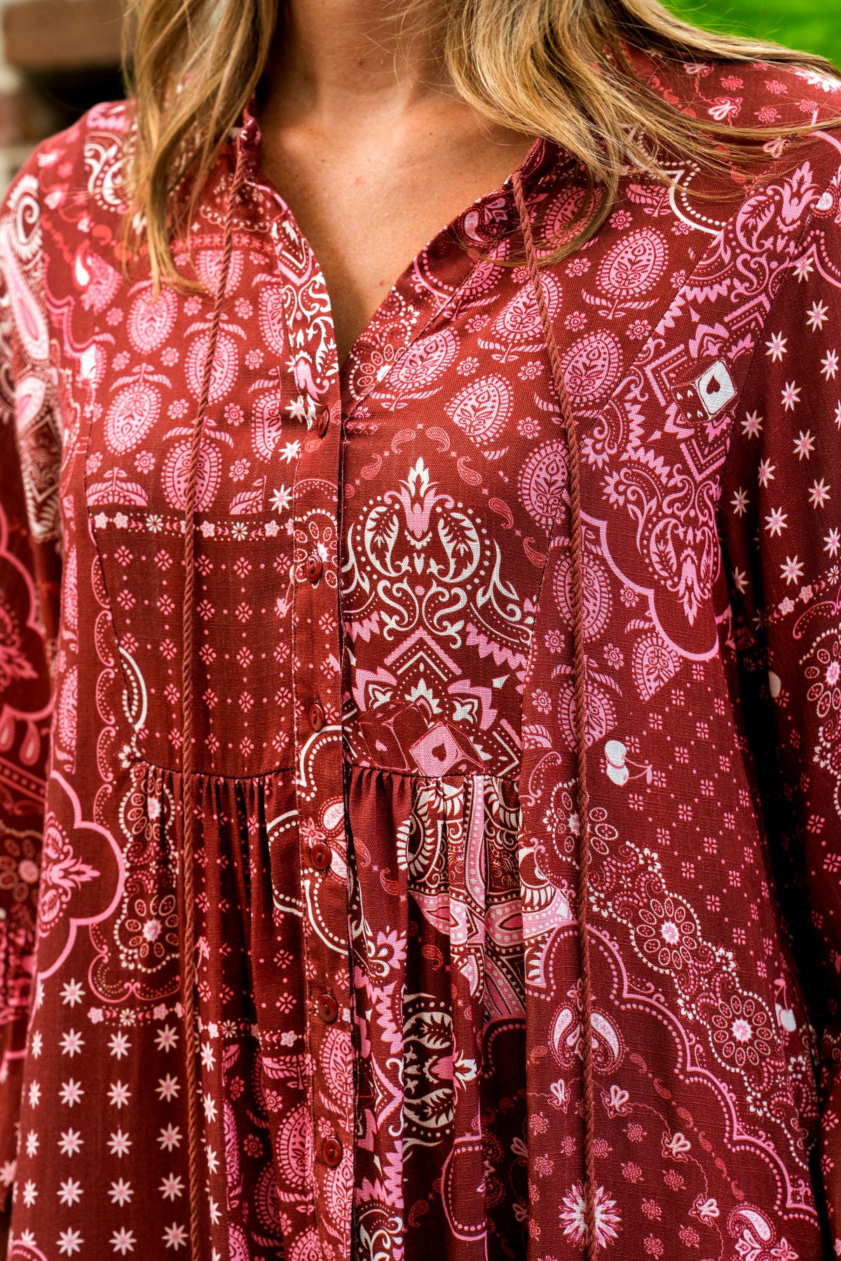 Meet the Rujuta Short Dress—your new go-to for effortless bohemian elegance with a playful twist. This maroon beauty brings together exclusive patchwork prints, flowing bell sleeves, and those all-important side seam pockets (because style should always be practical 🖤).