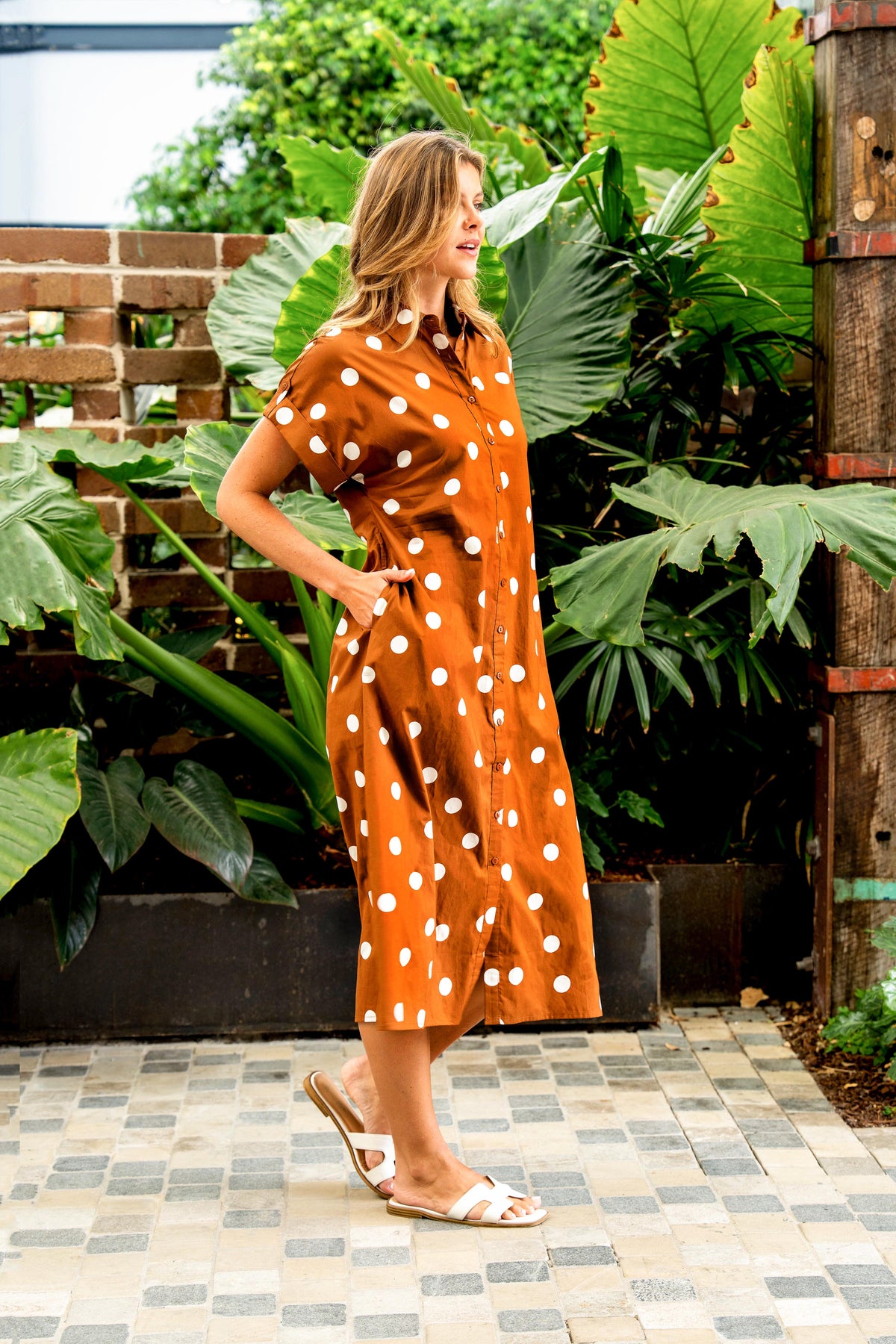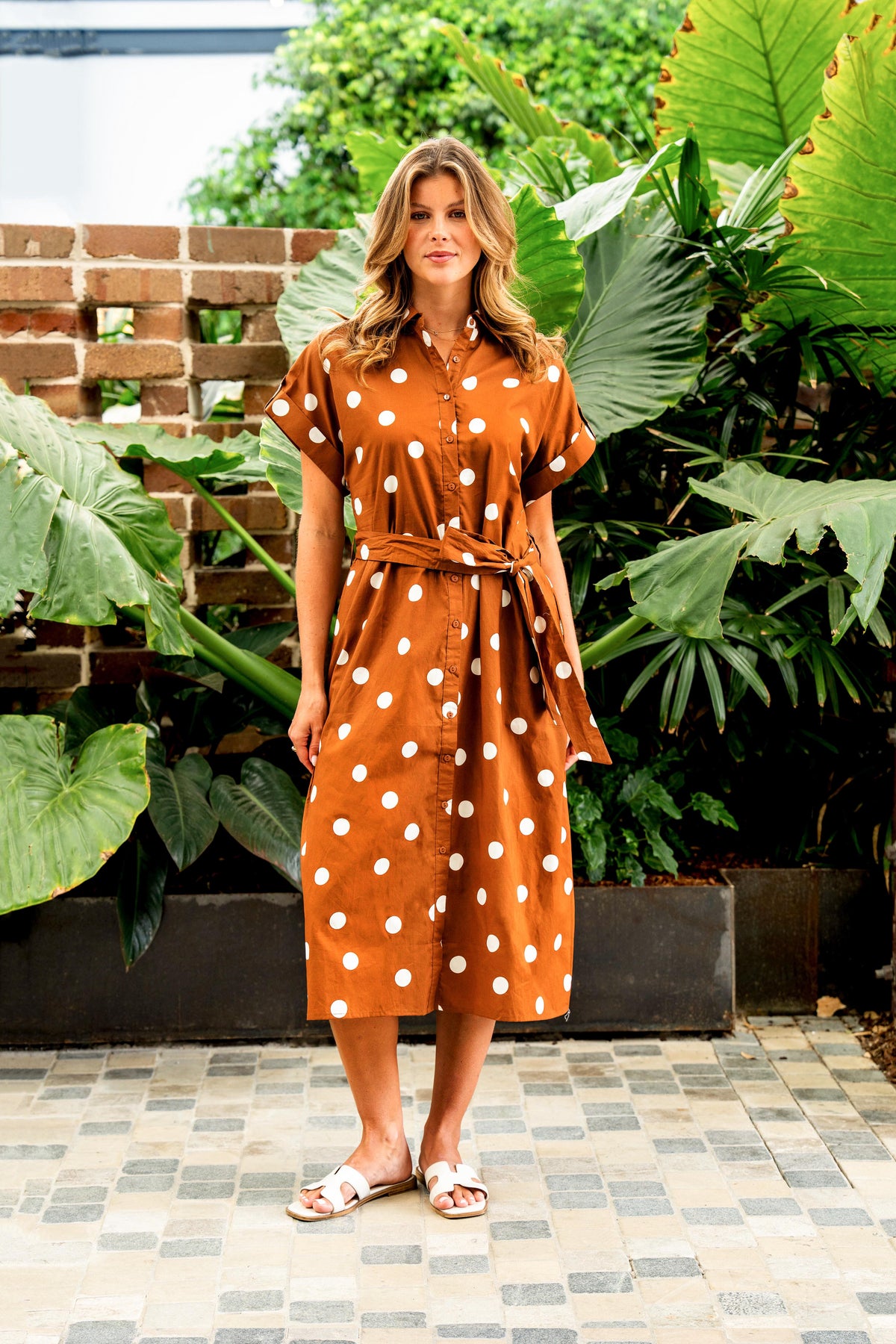 This gorgeous brown dot beauty is the dress that does it all. Whether you're heading to brunch, running errands, or meeting friends for drinks, the Vasquez has got you covered (literally and stylishly!).